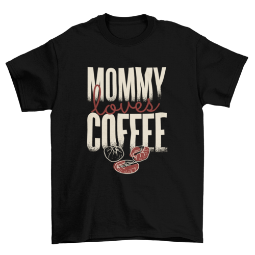 T-shirt design featuring a big and bold "Mommy loves Coffee" caption with coffee beans illustration.